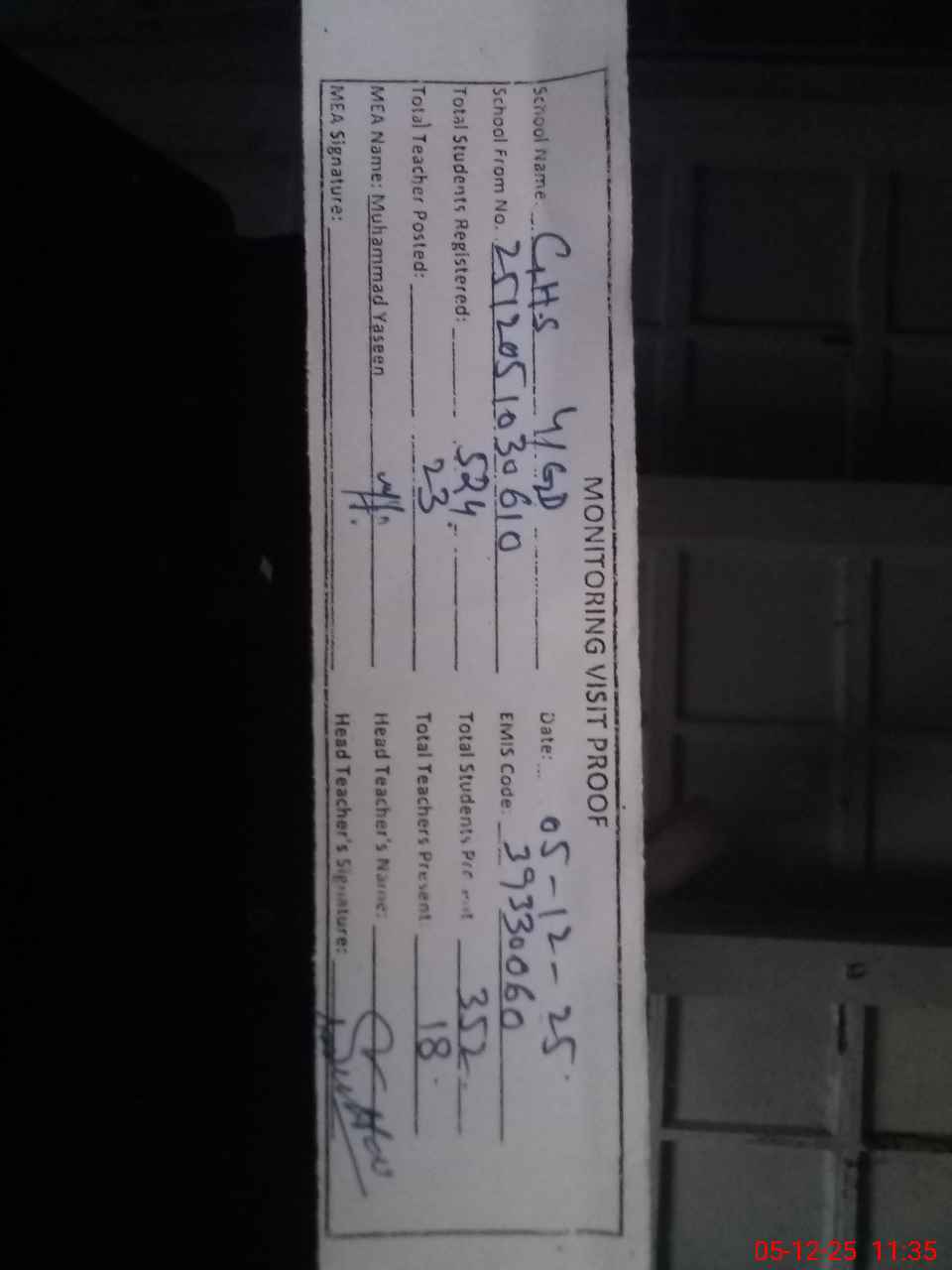 | Attendance Register | Head Teacher | MEA with School | Visit Proof |