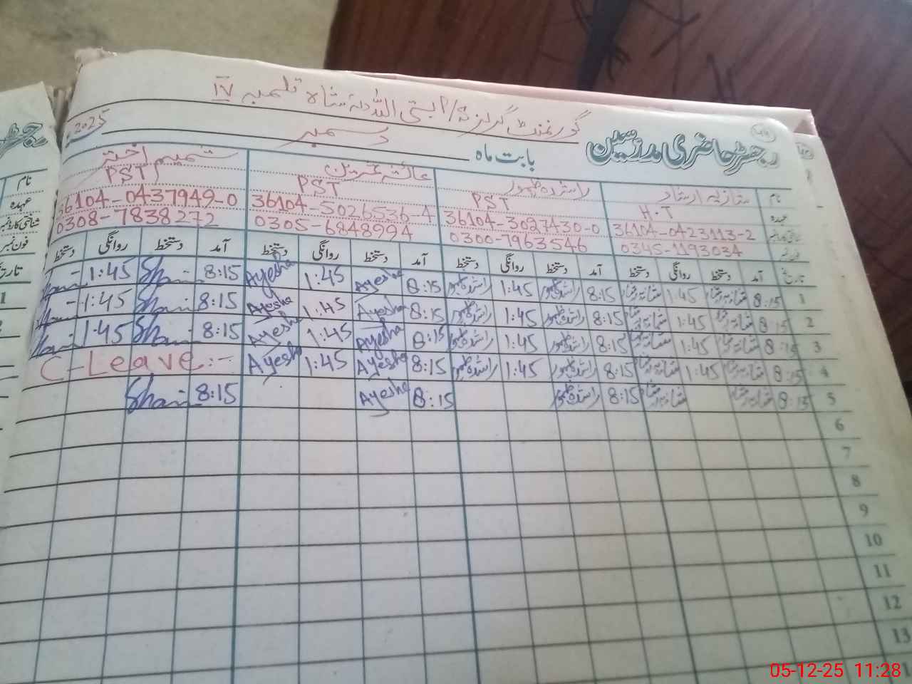 | CNIC | Full Name | Designation | R/C | Absence During Last Calender Month |