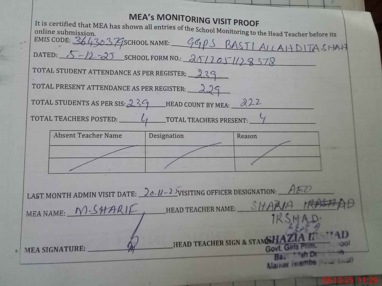 | Attendance Register | Head Teacher | MEA with School | Visit Proof |