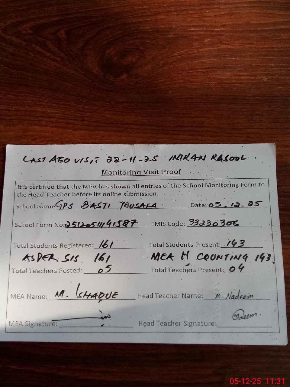 | Attendance Register | Head Teacher | MEA with School | Visit Proof |