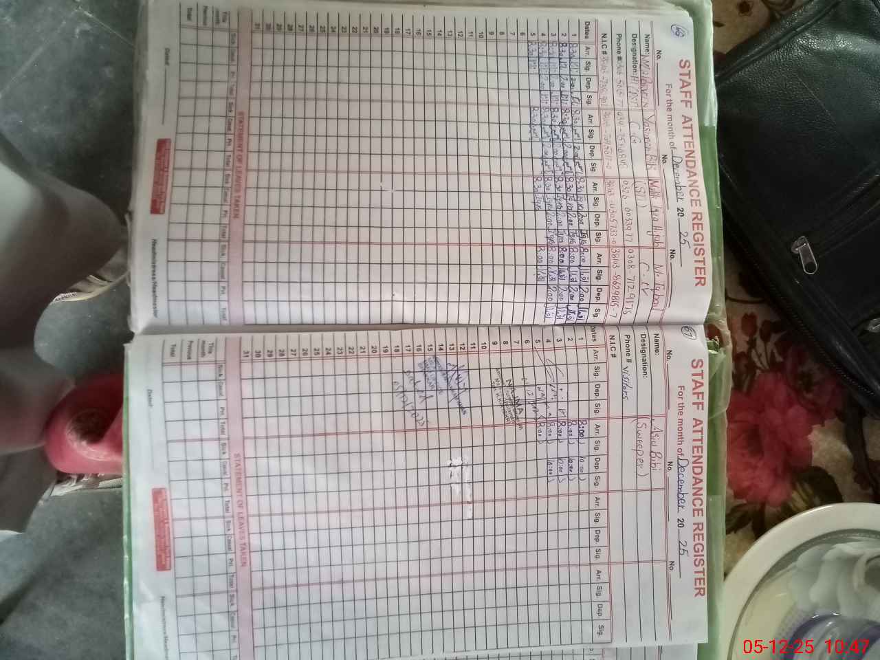| Total no. of Classrooms: 2 No. of Classrooms Used for Teaching: 2 No. of Classrooms Storing Old Furniture, FTBs, etc: 0Comments if Any: Last visit of dep AEO Najma Parveen on 1 December, 2025 and NSB and FTF record not maintain |