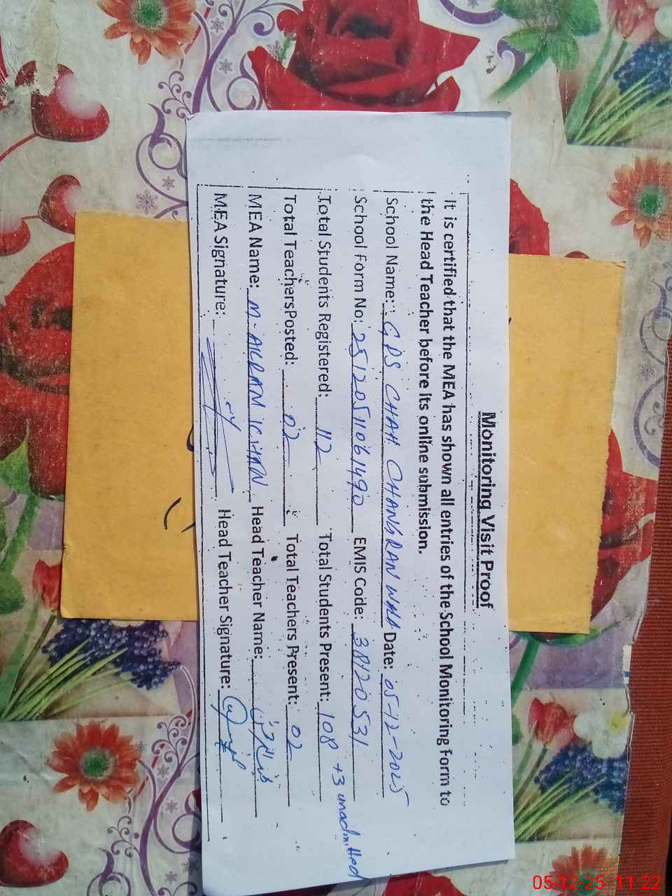 | Attendance Register | Head Teacher | MEA with School | Visit Proof |