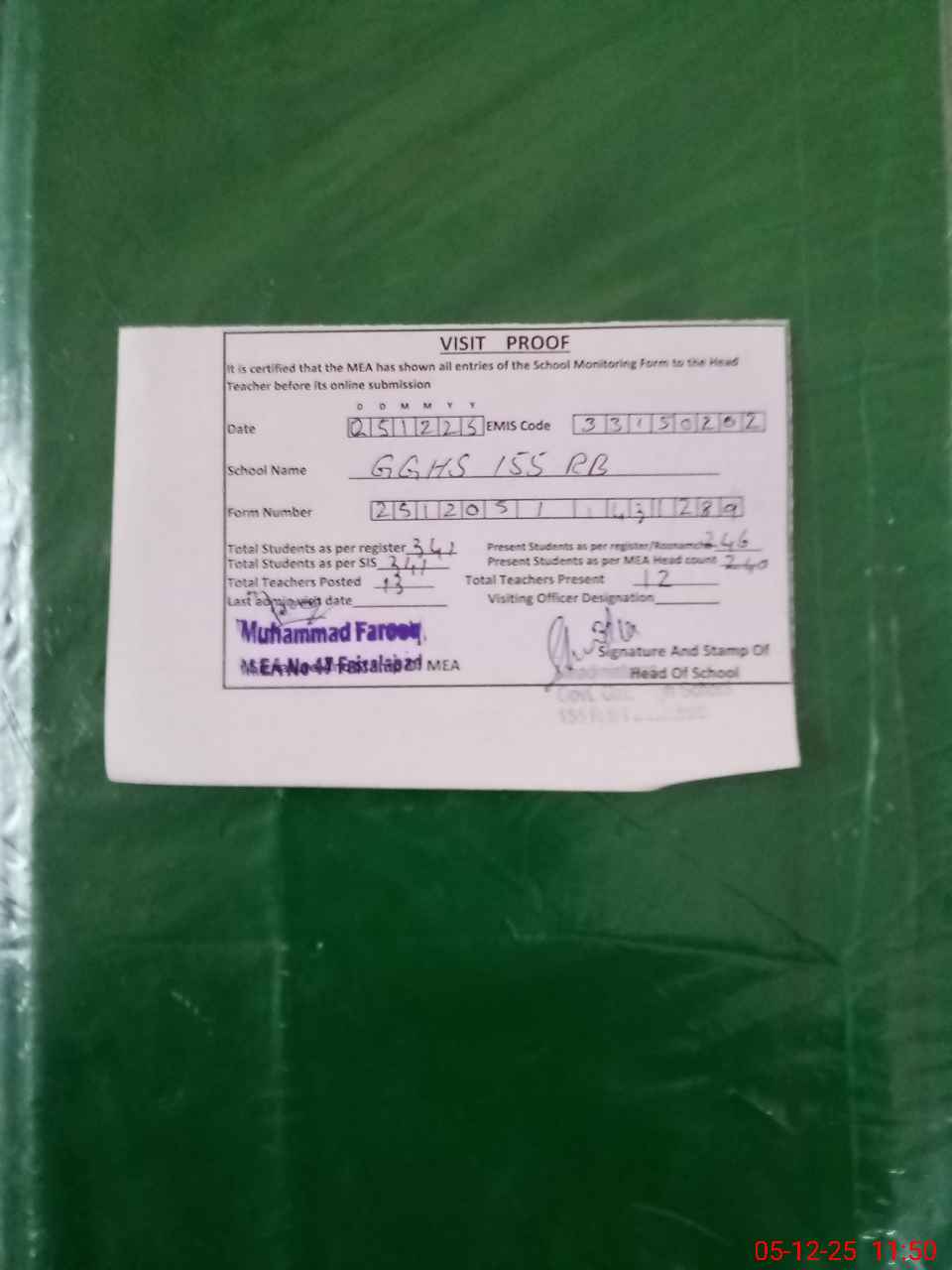 | Attendance Register | Head Teacher | MEA with School | Visit Proof |