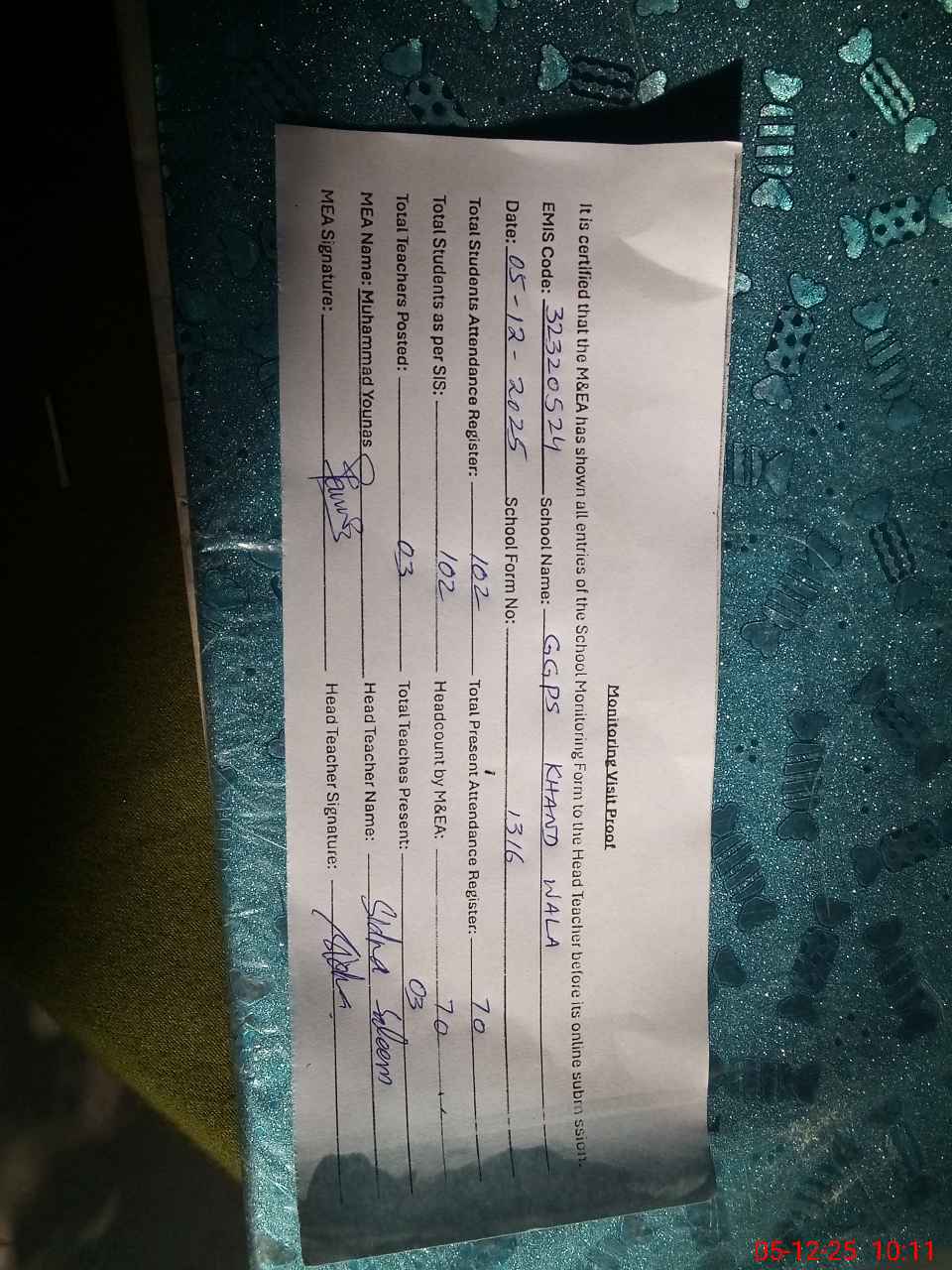 | Attendance Register | Head Teacher | MEA with School | Visit Proof |