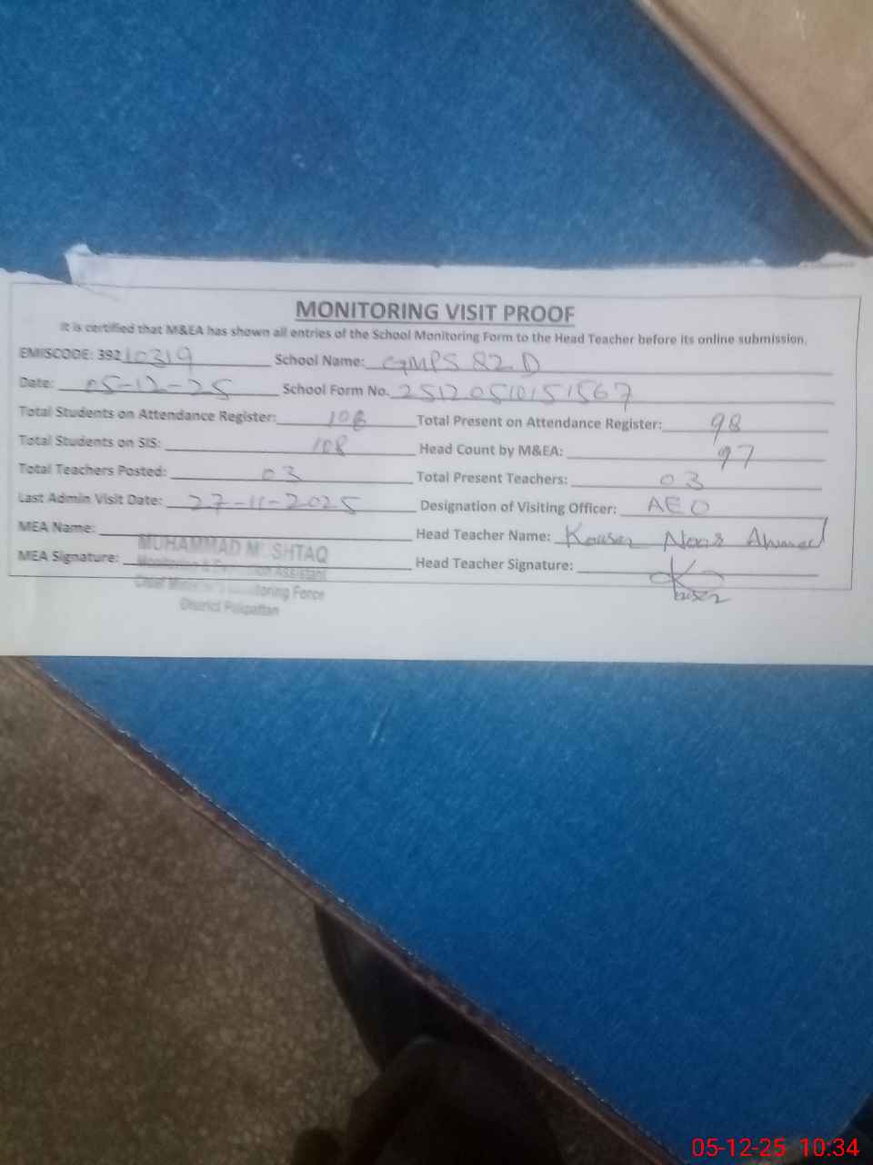| Attendance Register | Head Teacher | MEA with School | Visit Proof |