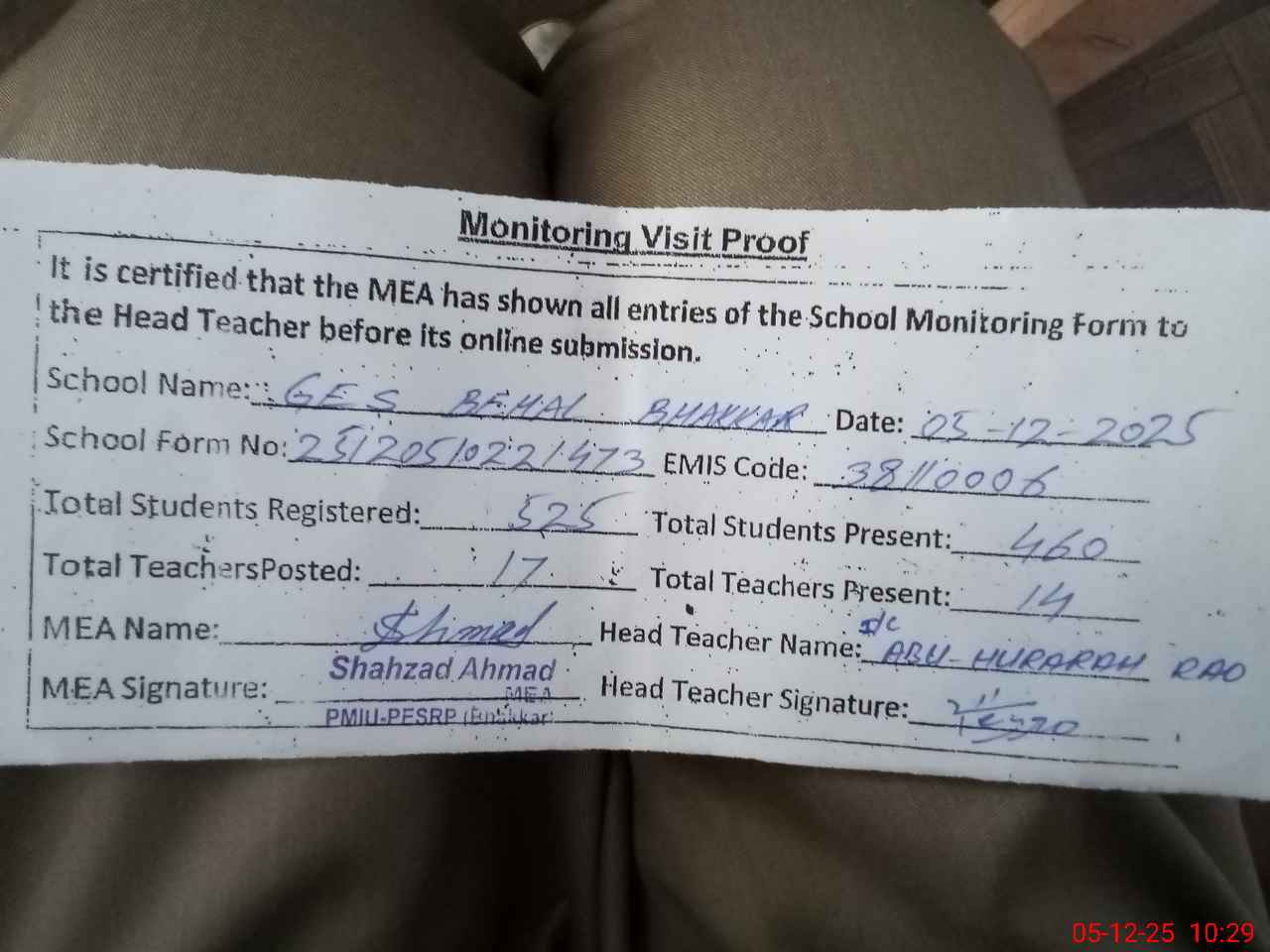 | Monitoring Date: 05-12-2025 | Start Time: 05-12-2025 09:26 AM | End Time: 05-12-2025 10:29 AM | Name of MEA: SH**** AH**** | |