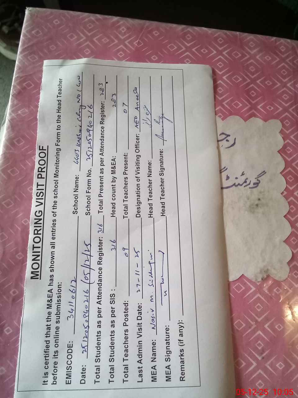 | Attendance Register | Head Teacher | MEA with School | Visit Proof |