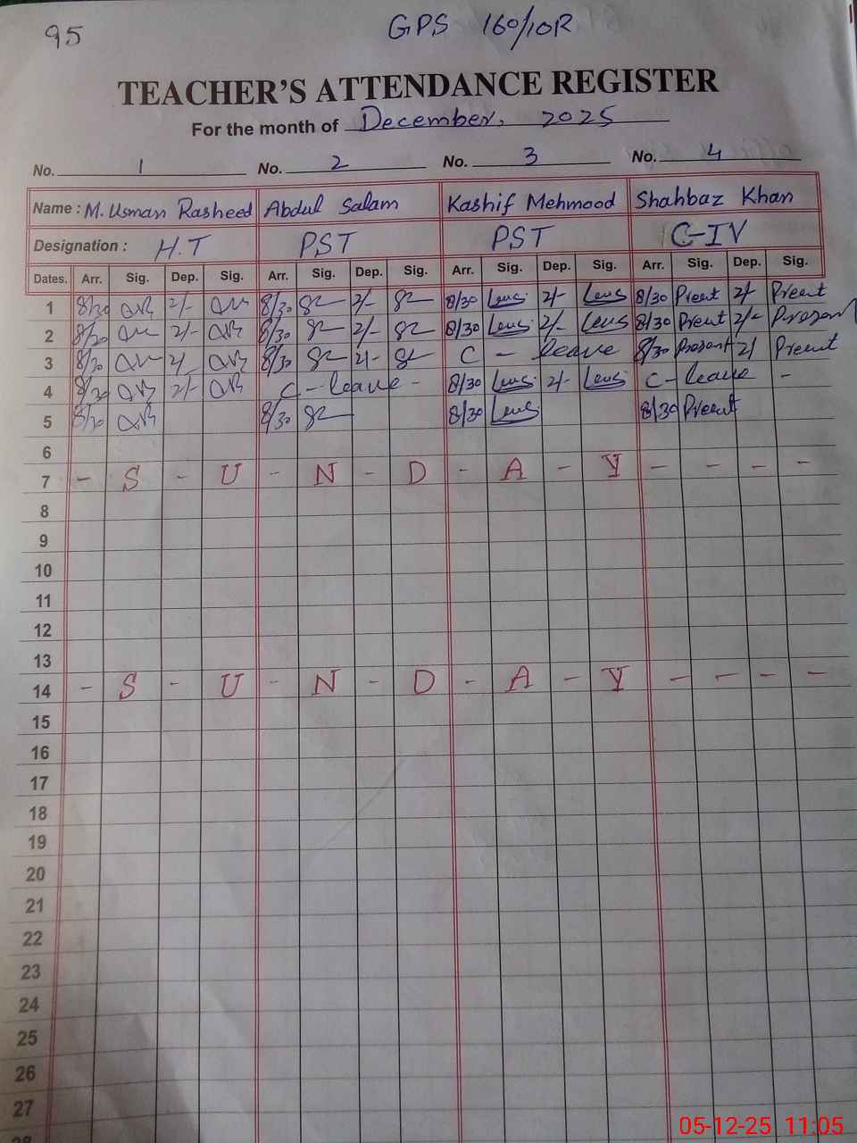 | CNIC | Full Name | Designation | R/C | Absence During Last Calender Month |