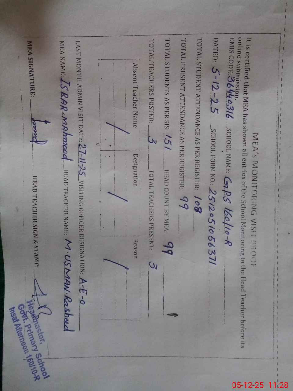 | Attendance Register | Head Teacher | MEA with School | Visit Proof |
