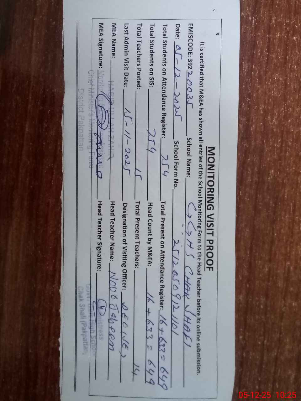 | EMIS Code: 39220035 | Name of School: GGHS CHAK SHAFI | |||