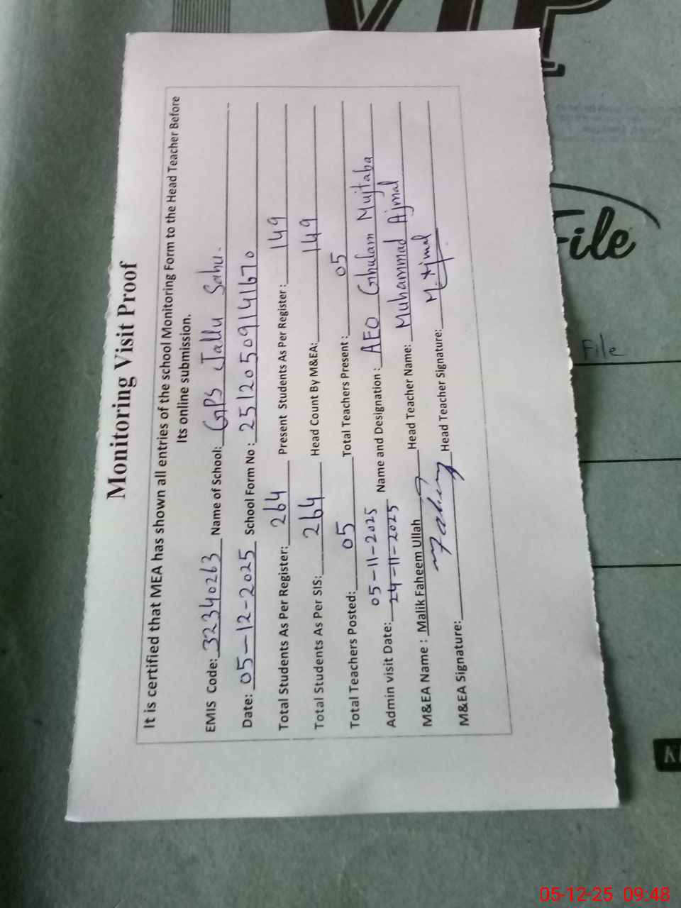 | Attendance Register | Head Teacher | MEA with School | Visit Proof |