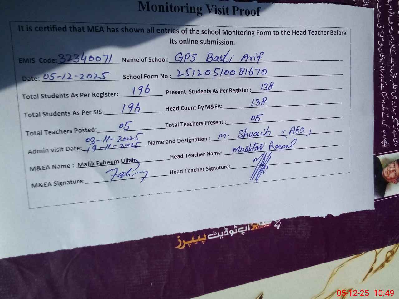 | EMIS Code: 32340071 | Name of School: GPS BASTI ARIF | |||
