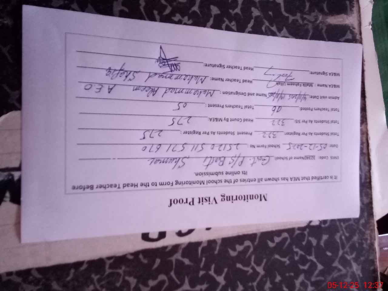 | Attendance Register | Head Teacher | MEA with School | Visit Proof |