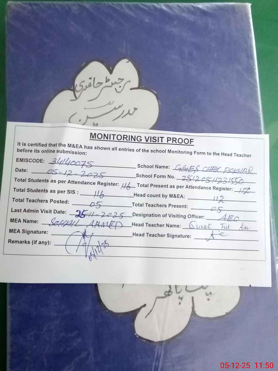 | Attendance Register | Head Teacher | MEA with School | Visit Proof |