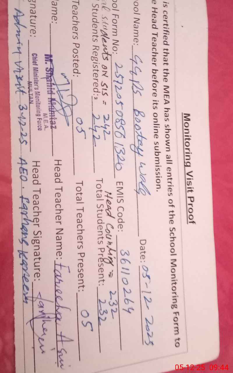 | EMIS Code: 36110264 | Name of School: GGPS BOOTAY WALA NEAR SEETAL MARI | |||