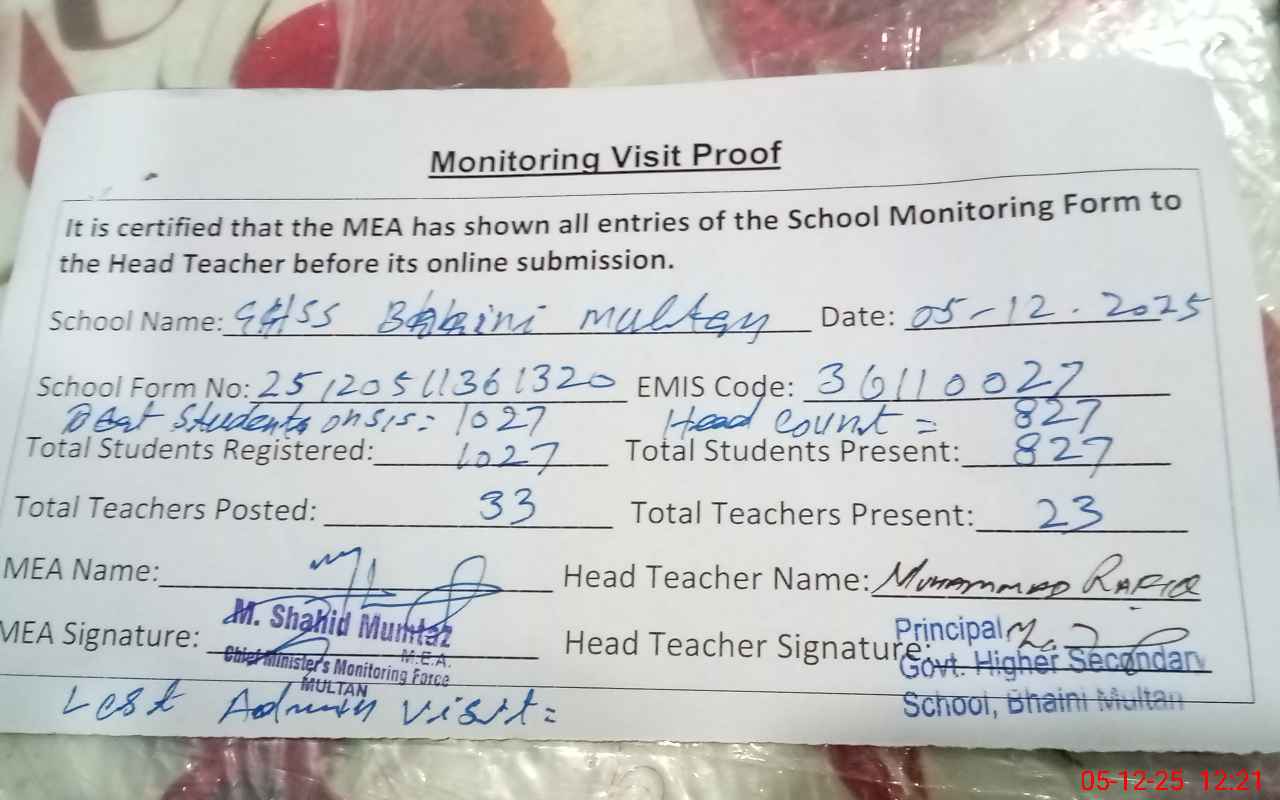 | EMIS Code: 36110027 | Name of School: GHSS BHAINI BUDHLA ROAD MULTAN | |||