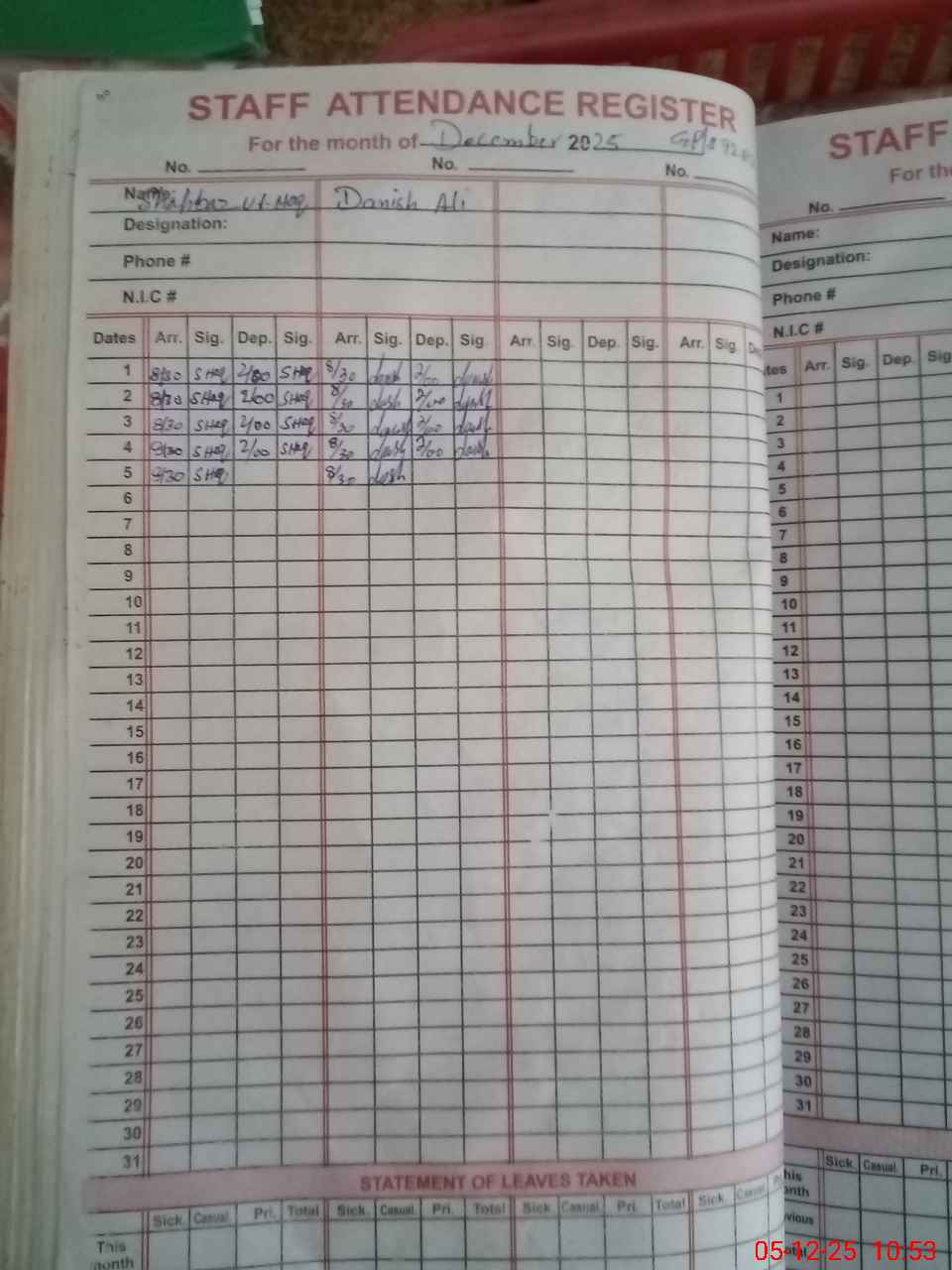 | CNIC | Full Name | Designation | R/C | Absence During Last Calender Month |