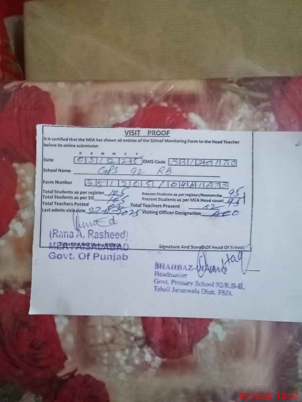 | Attendance Register | Head Teacher | MEA with School | Visit Proof |