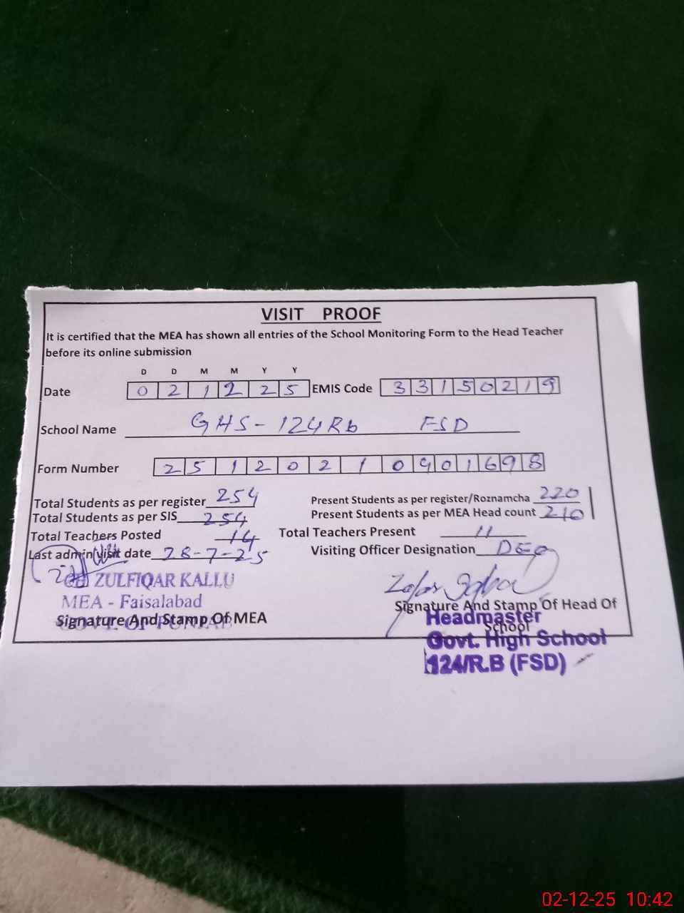 | EMIS Code: 33150219 | Name of School: GHS CHAK 124 RB FSD | |||