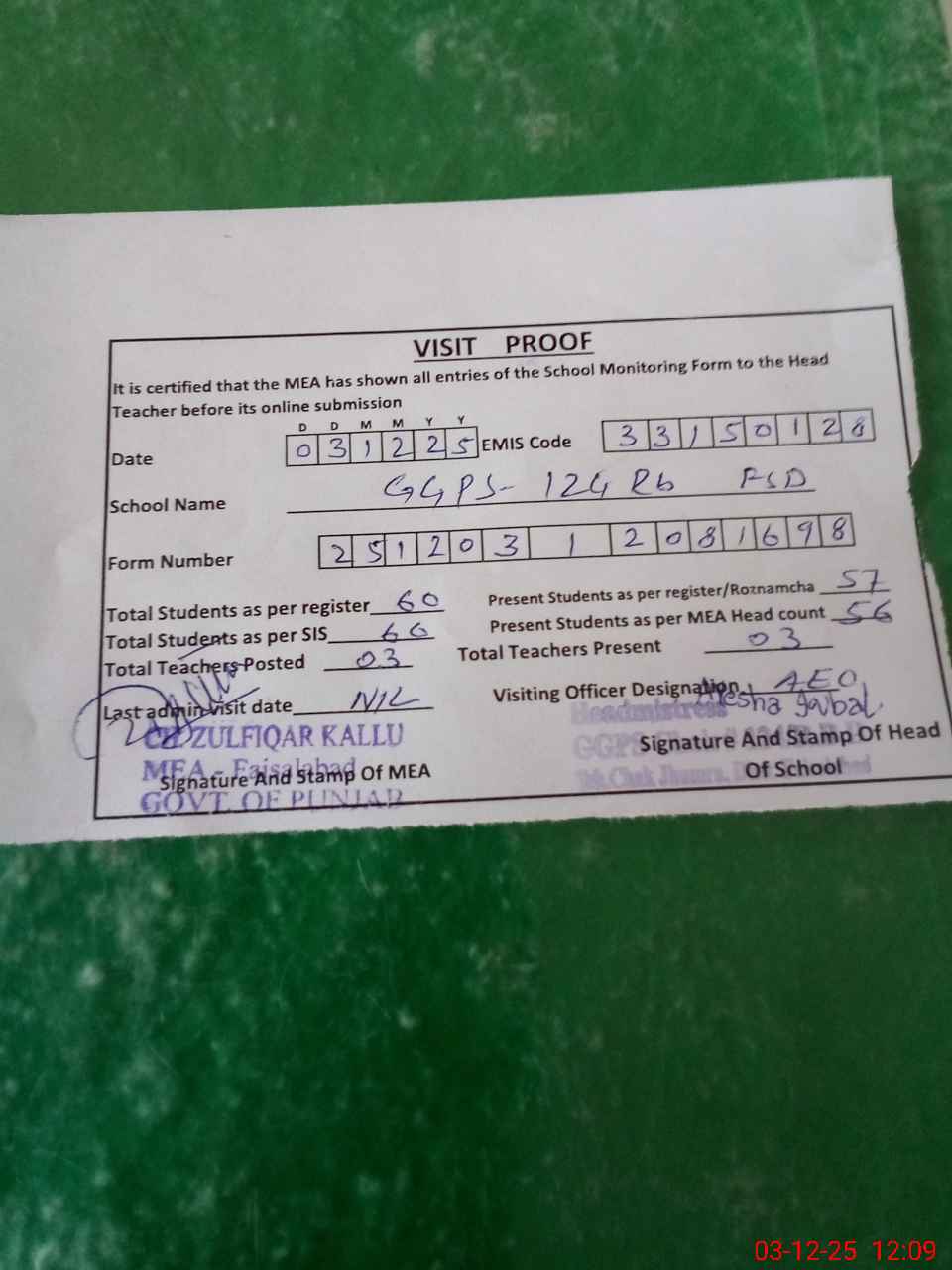 | Attendance Register | Head Teacher | MEA with School | Visit Proof |