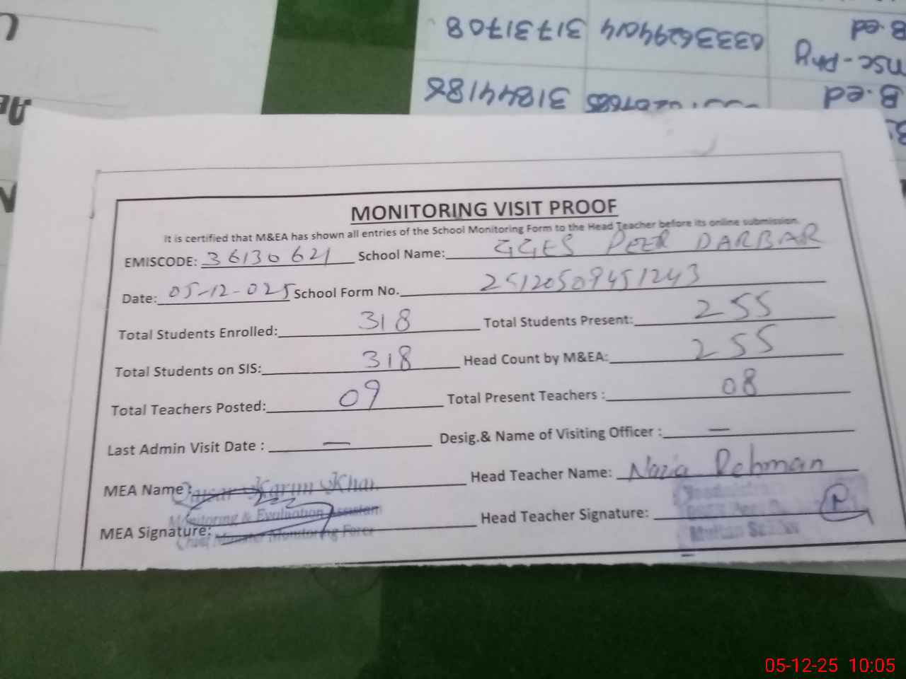 | Attendance Register | Head Teacher | MEA with School | Visit Proof |