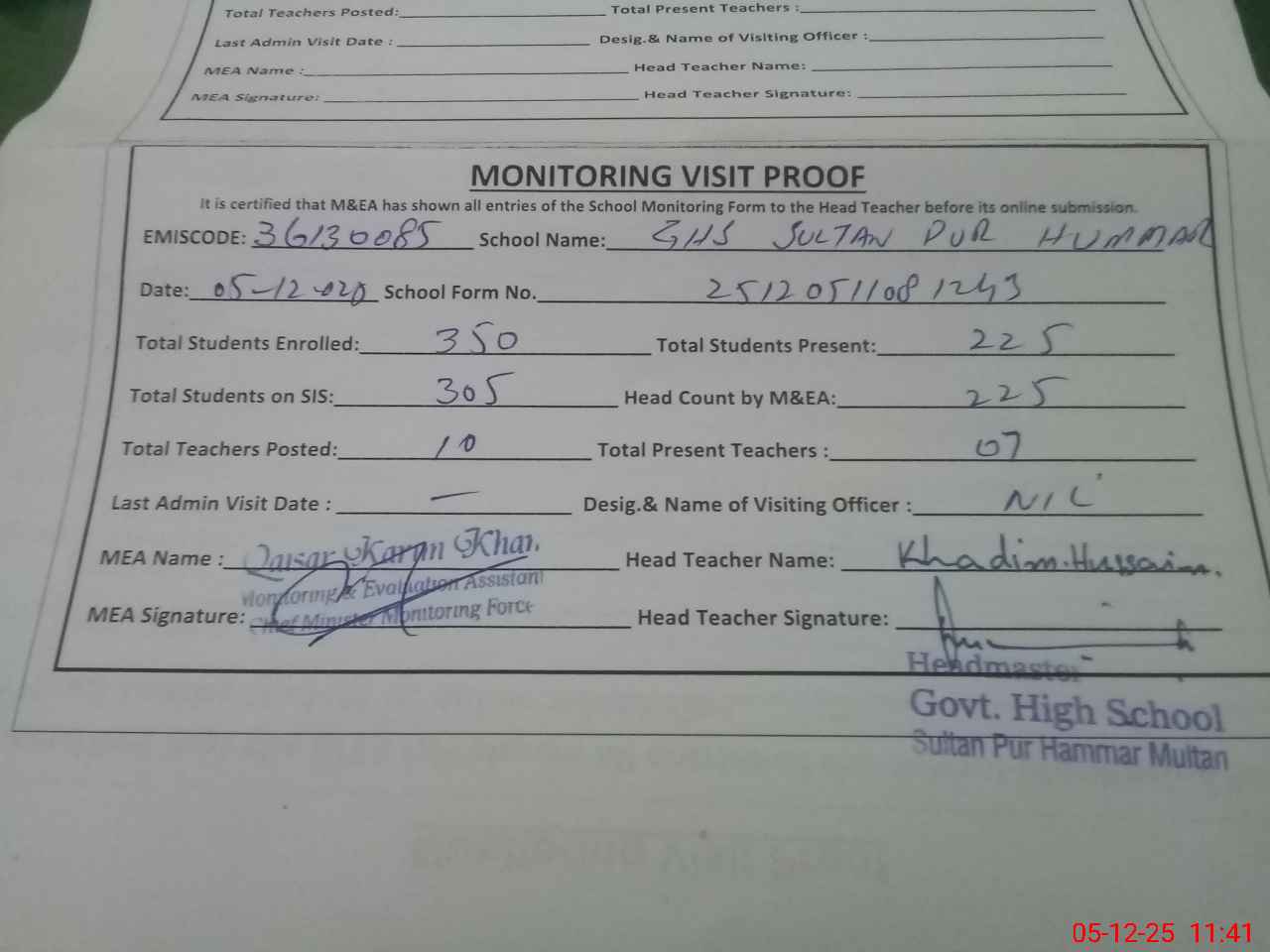 | EMIS Code: 36130085 | Name of School: GHS SULTAN PUR HUMMER P/O SHER SHAH MULTAN | |||