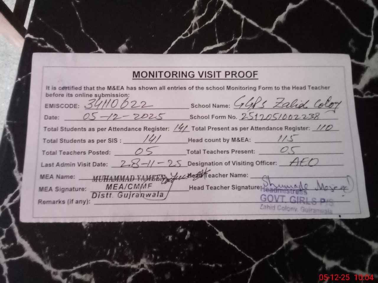 | Attendance Register | Head Teacher | MEA with School | Visit Proof |