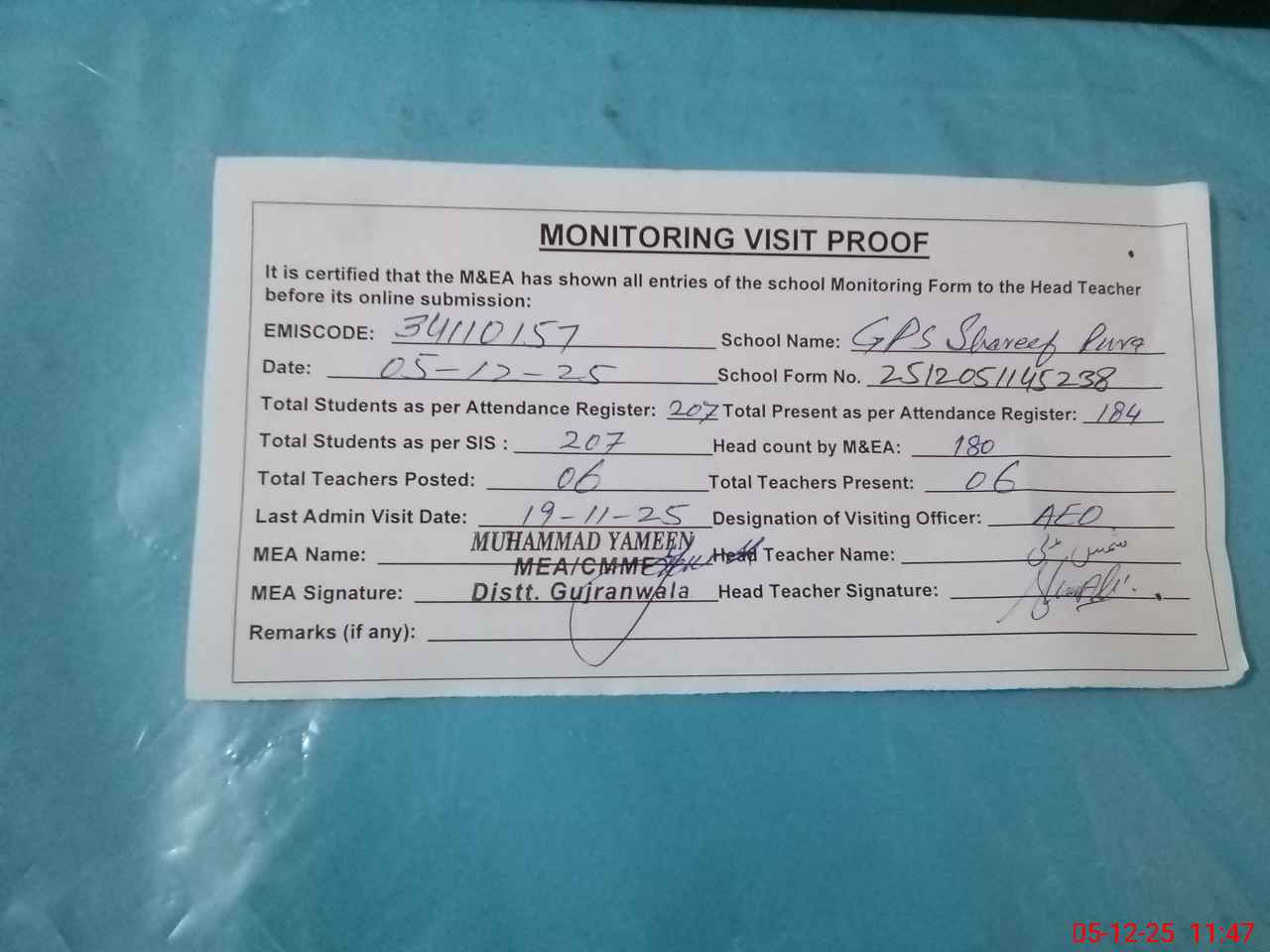 | EMIS Code: 34110157 | Name of School: GPS SHARIF PURA | |||