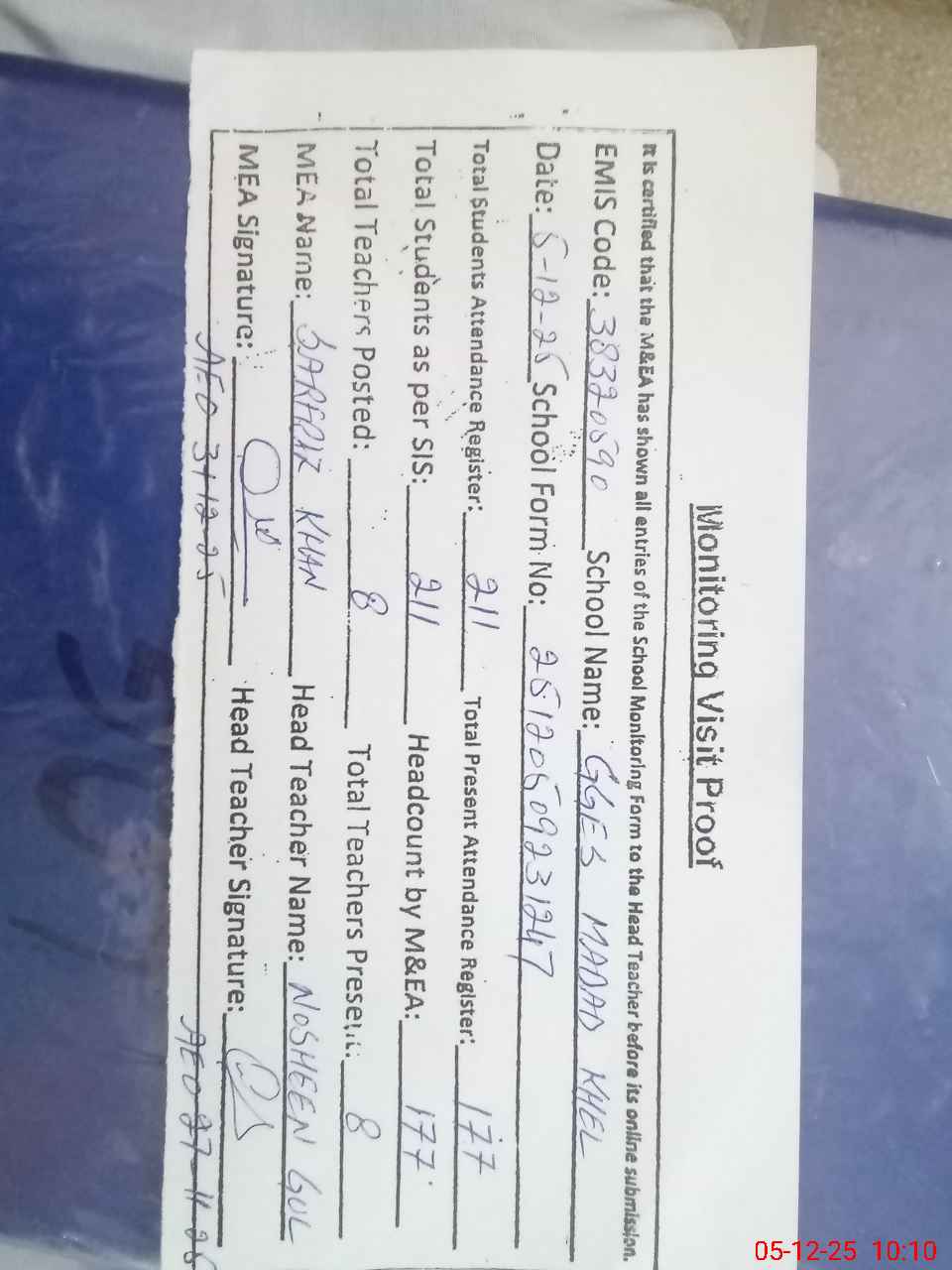 | Attendance Register | Head Teacher | MEA with School | Visit Proof |