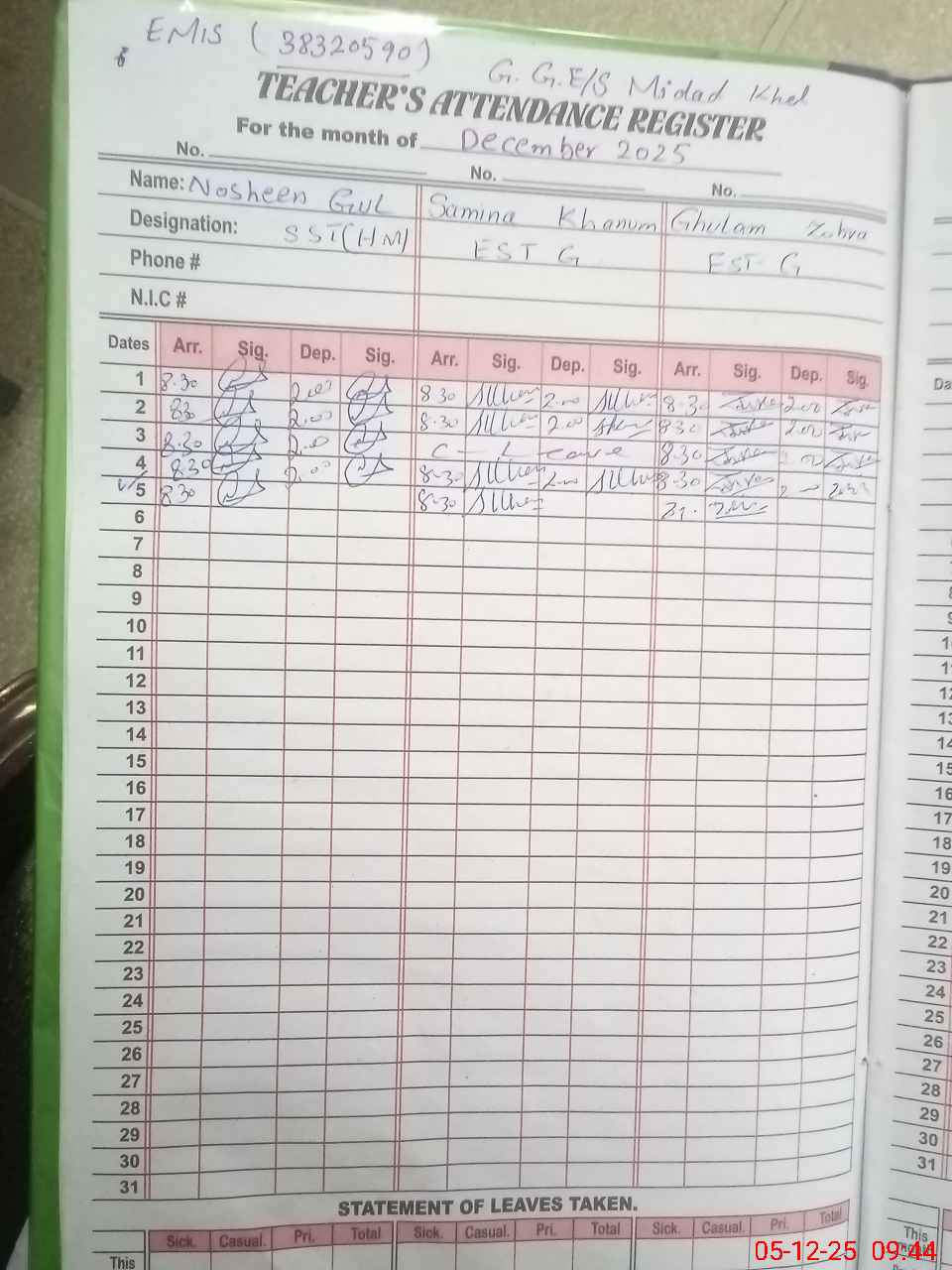| CNIC | Full Name | Designation | R/C | Absence During Last Calender Month |