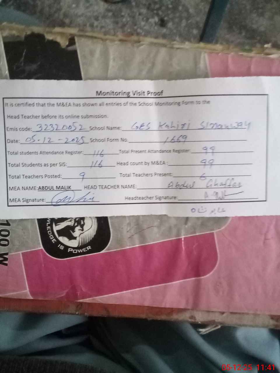 | Attendance Register | Head Teacher | MEA with School | Visit Proof |