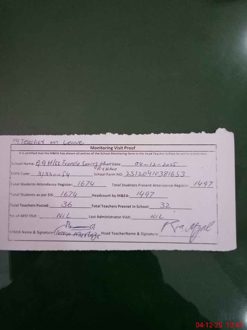 | Attendance Register | Head Teacher | MEA with School | Visit Proof |