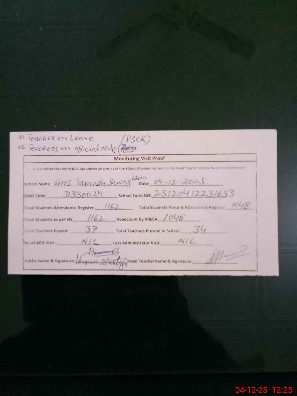 | Attendance Register | Head Teacher | MEA with School | Visit Proof |