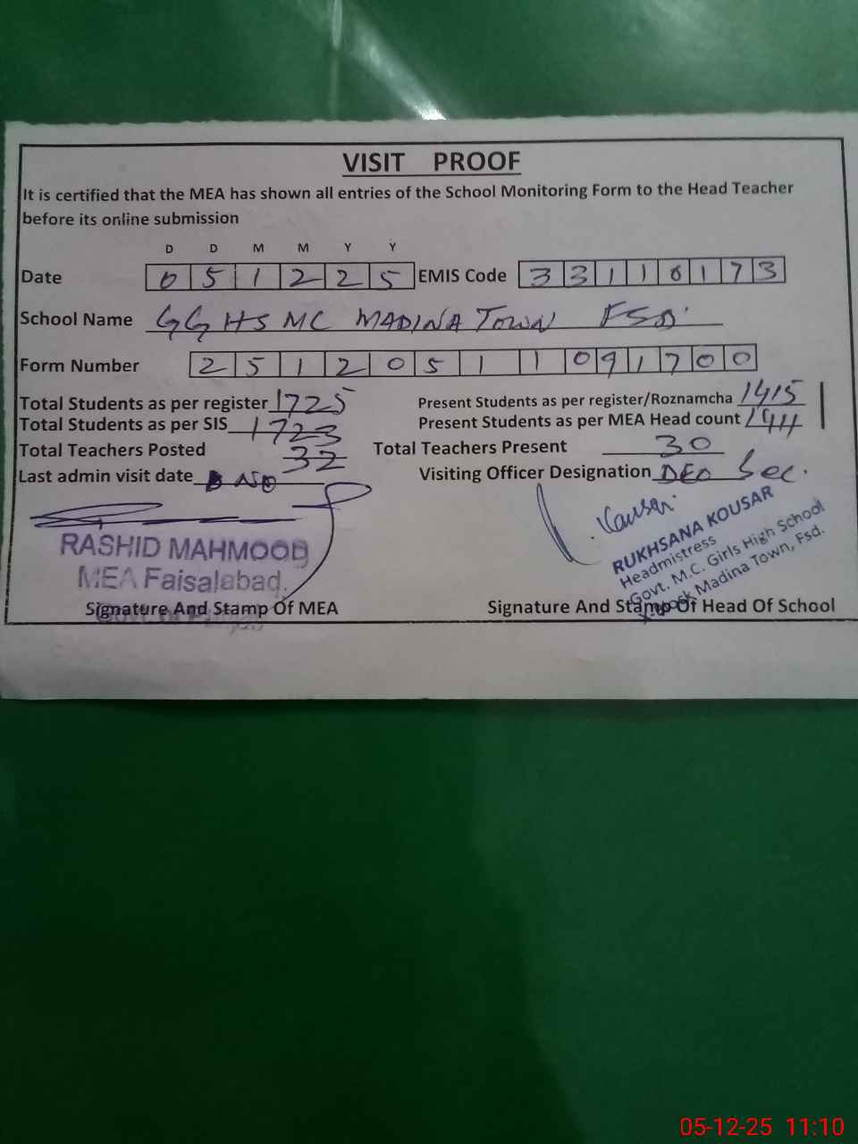| Certified that this School was Inspected by the Undersigned MEA/DMO Today and the Information Stated Above is as Per Record. | |||||