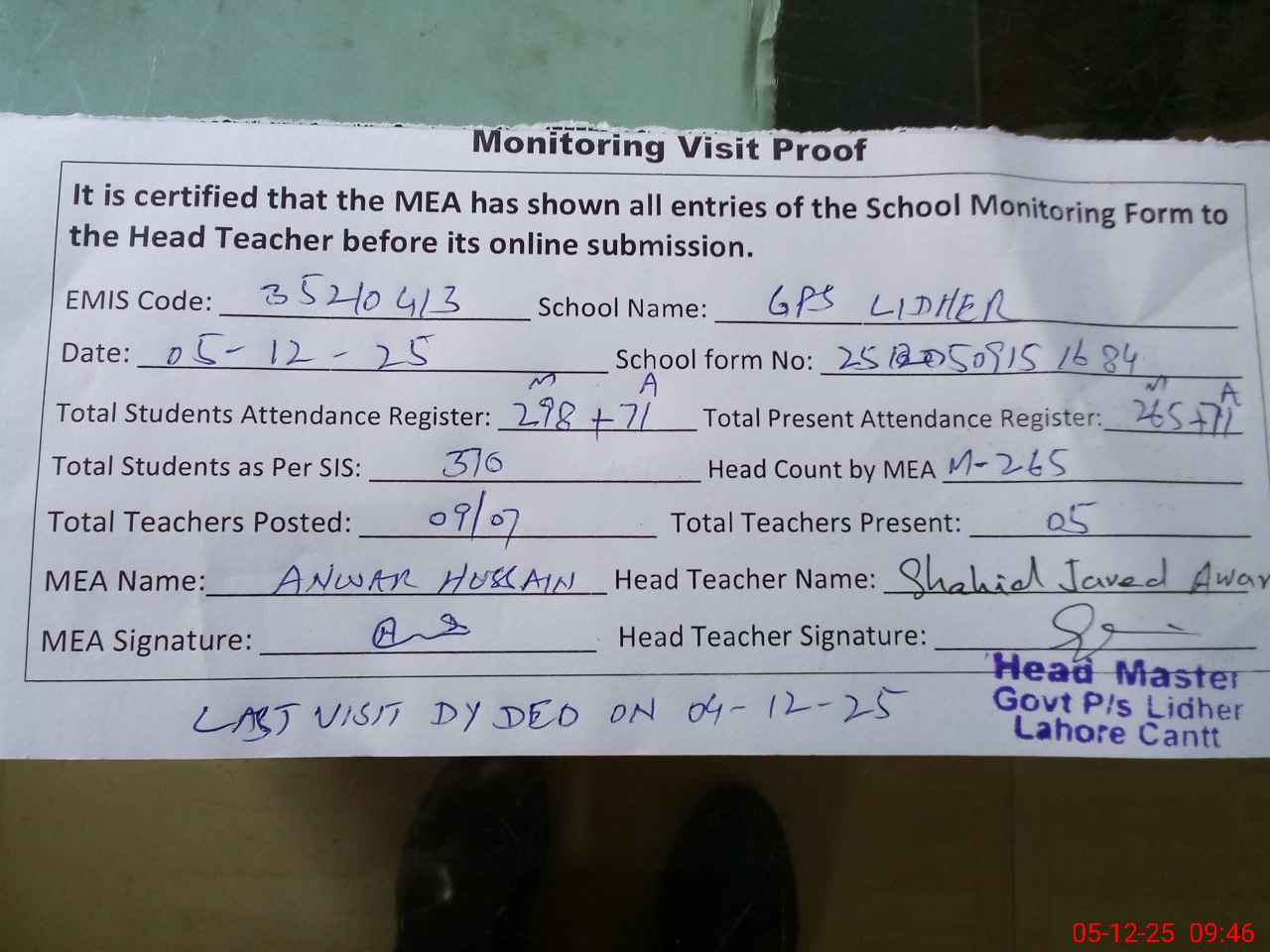 | Remarks (Use Separate Page if Required): Dy DEO visited on 04 December 2025 01 wash room under construction Asad Bilal PST transfer to Military Account wef 07 January 2025 but his name still available in Teacher list Subohi Ahmed PST removal from service wef 01 October 2022 to till date 35210413 | |||||