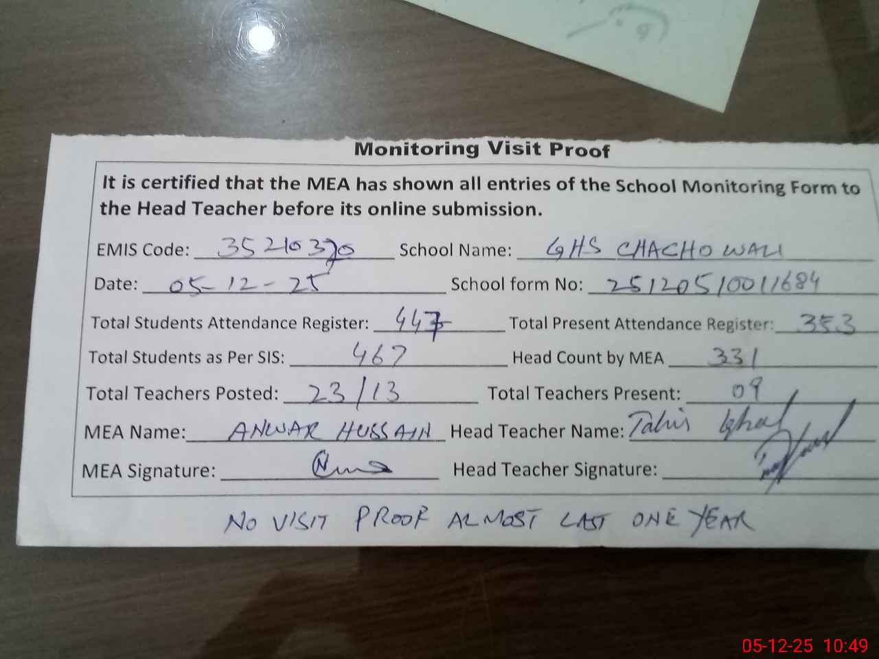 | Attendance Register | Head Teacher | MEA with School | Visit Proof |
