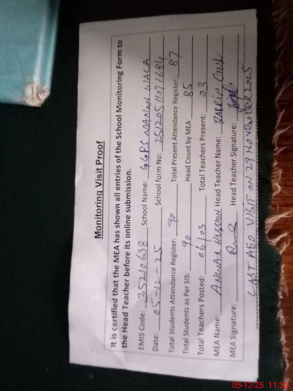 | Attendance Register | Head Teacher | MEA with School | Visit Proof |
