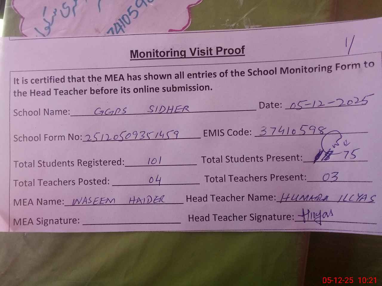 | Attendance Register | Head Teacher | MEA with School | Visit Proof |