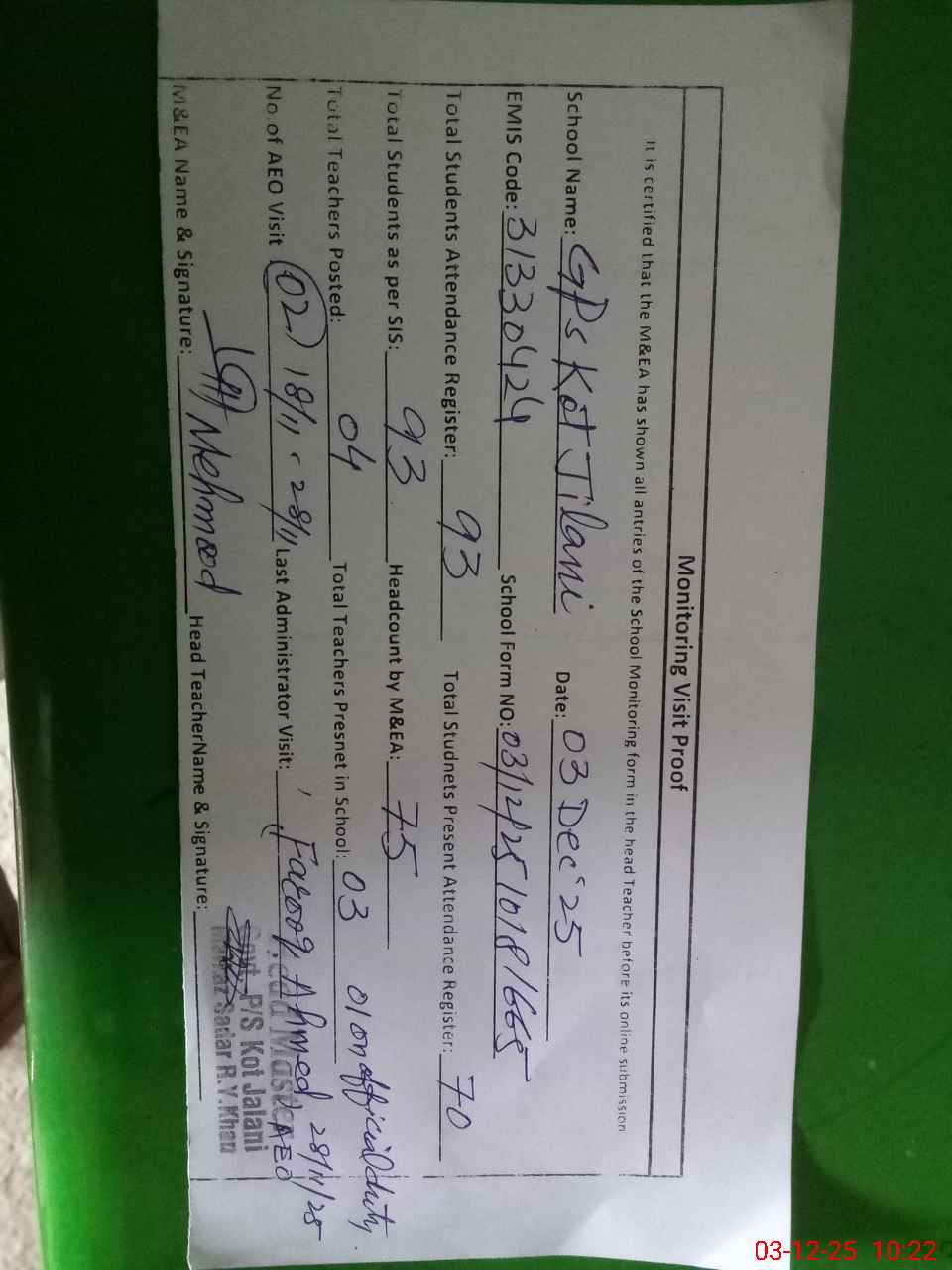| Attendance Register | Head Teacher | MEA with School | Visit Proof |