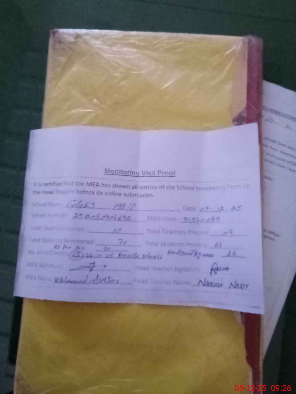 | Attendance Register | Head Teacher | MEA with School | Visit Proof |