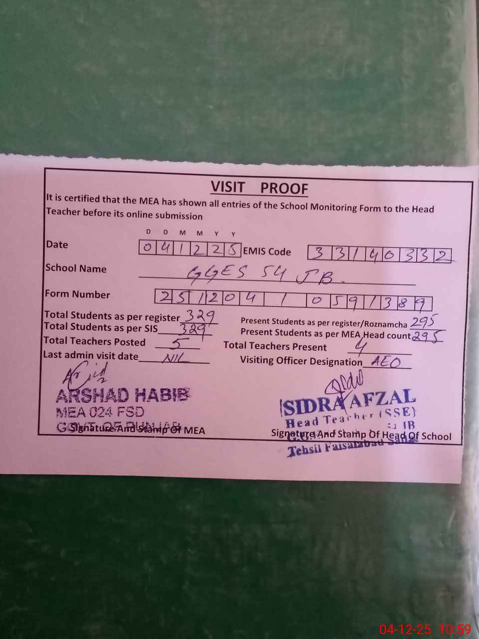 | Attendance Register | Head Teacher | MEA with School | Visit Proof |