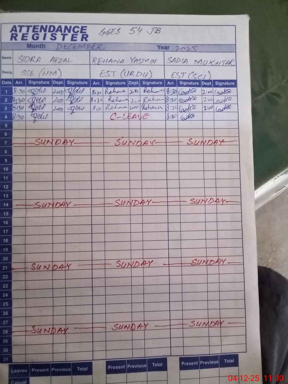 | CNIC | Full Name | Designation | R/C | Absence During Last Calender Month |