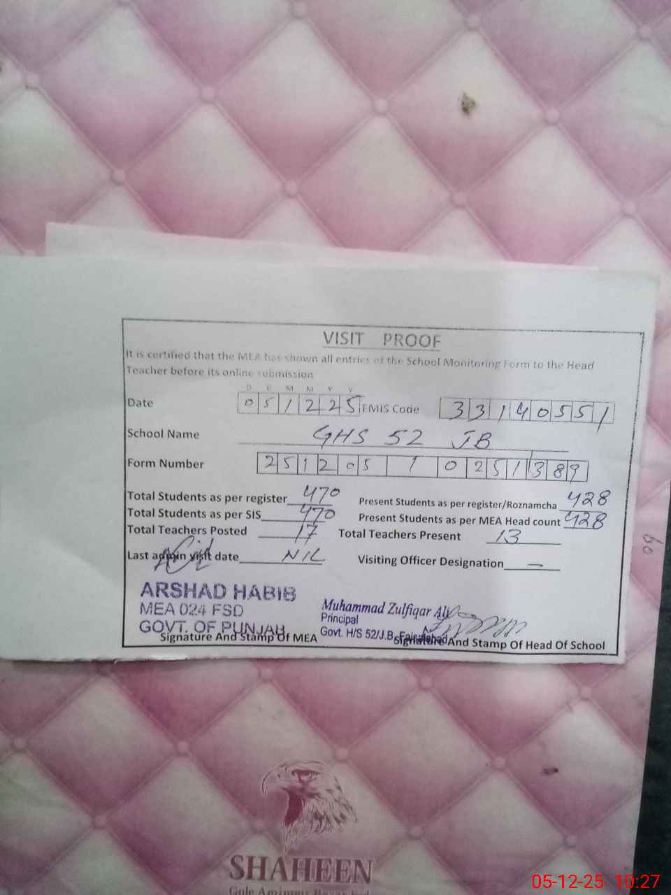 | EMIS Code: 33140551 | Name of School: GHS CHAK 52 JB MULLANPUR FSD | |||