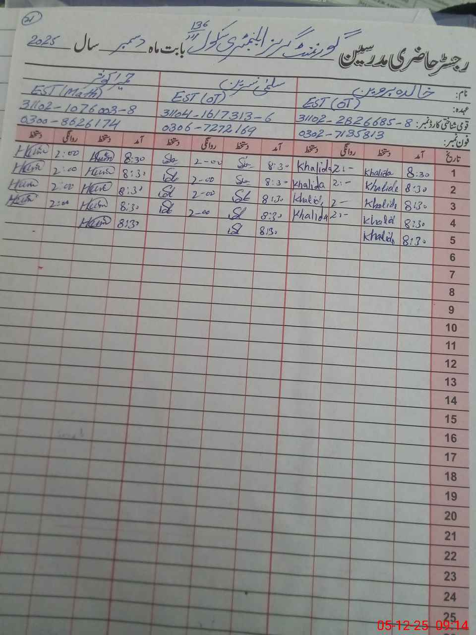| Name: KH**** PE**** Designation: (School Headmaster's/Headmistress's) E S T OT Phone/Cell Number: 03**** |