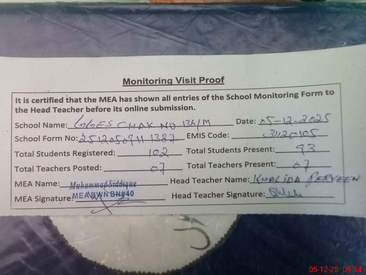 | Attendance Register | Head Teacher | MEA with School | Visit Proof |