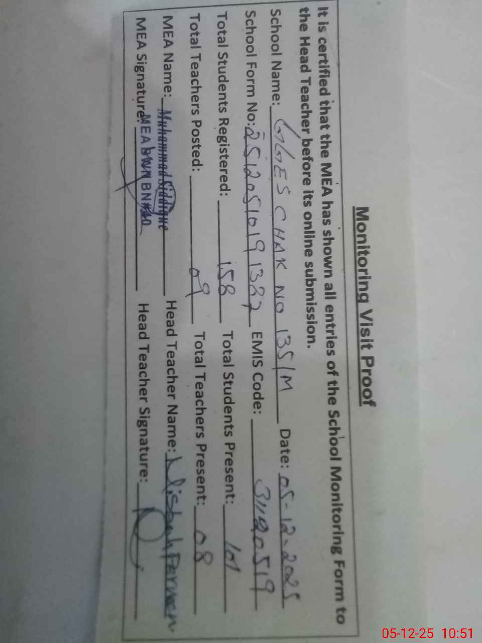 | EMIS Code: 31120519 | Name of School: GGES CHAK NO. 135 MURAD | |||