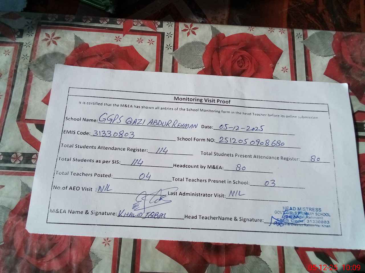 | Attendance Register | Head Teacher | MEA with School | Visit Proof |