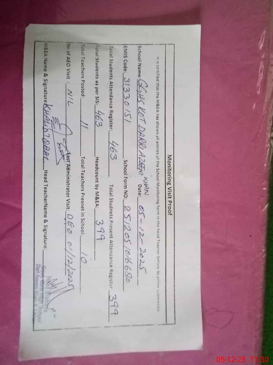 | Attendance Register | Head Teacher | MEA with School | Visit Proof |