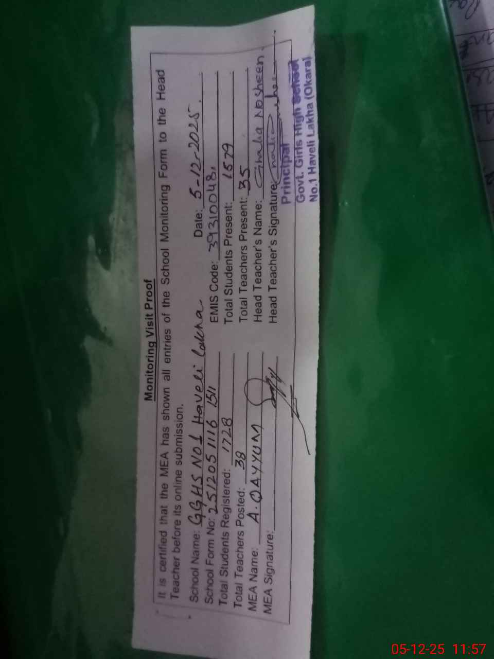 | Certified that this School was Inspected by the Undersigned MEA/DMO Today and the Information Stated Above is as Per Record. | |||||