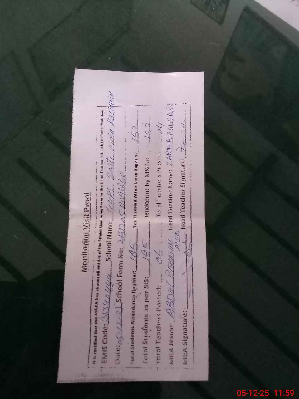 | Attendance Register | Head Teacher | MEA with School | Visit Proof |